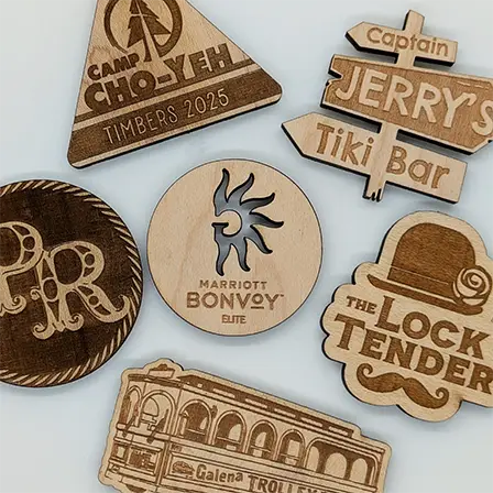 Along with tokens, we also make other personalized wooden goods like keychains, magnets, coasters, ornaments, and other fun items our lasers can intricately cut and engrave.